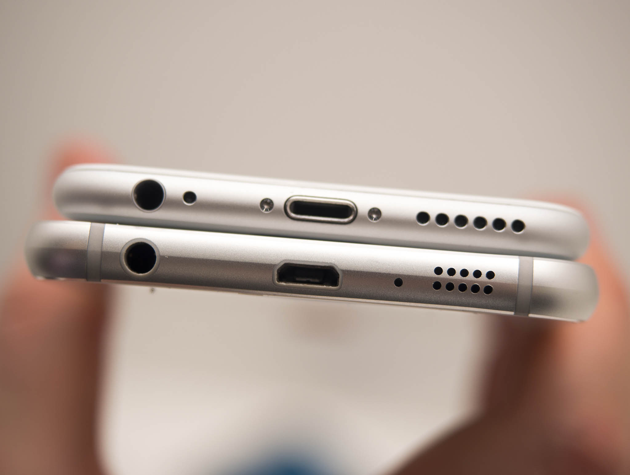 Yes, from below, the Galaxy S6 and iPhone 6 share some serious visual similarities. In that, they're machined out of aluminum and have machined holes for the 3.5mm headphone jack, a center-mounted USB or lightning port, and holes for speaker grilles drilled into the right side. There are even the Apple-style plastic-filled stripes that break it up into visual segments and a color-matched chrome-ringed home button. From the bottom you might think that the Galaxy S6 is another version of the iPhone.
